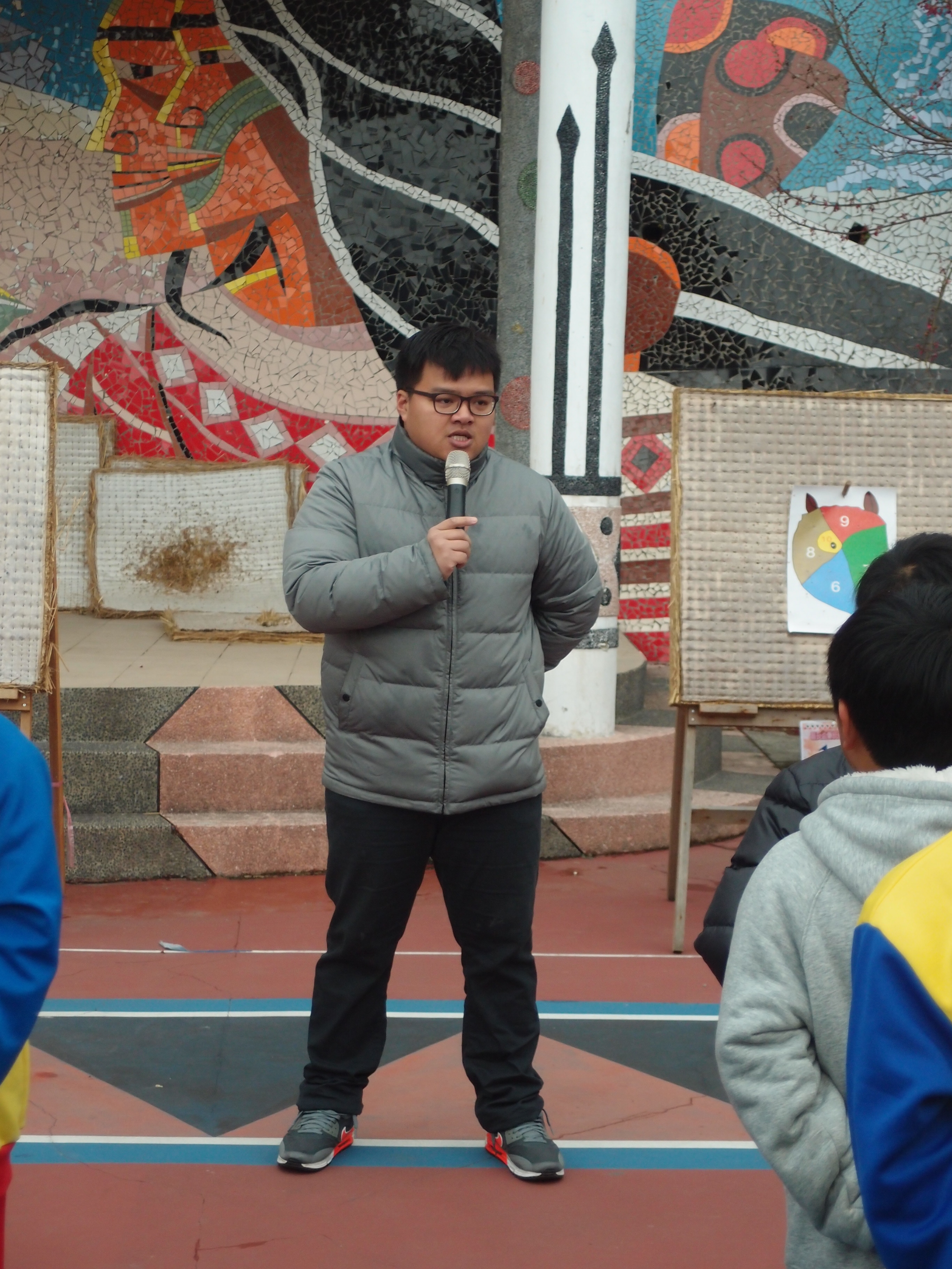 訓導組長於朝會時宣導節電-隨手關燈、隨手關電扇電源