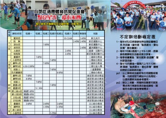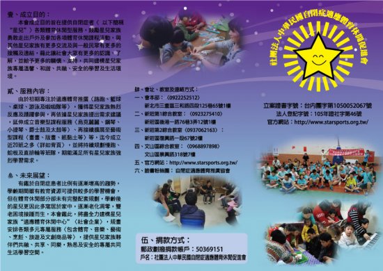 一、本會長期致力於自閉症孩童〈以下簡稱星兒〉各類體育休閒活動之推廣與執行,然寒假將屆,為維持星兒家族學習之常軌,遂於寒期安排各項活動及課程,以利星兒家族自行選擇、規劃及參與。