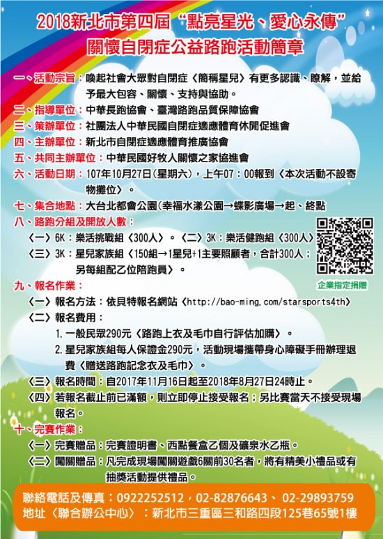 主旨:檢送本會策辦107年度〈含寒假〉“點亮星光、愛心永傳”各類班隊活動暨第四屆關懷自閉症公益路跑實施內容,詳如附件及說明,懇請協助轉知相關部門及人員,鼓勵多多參與!