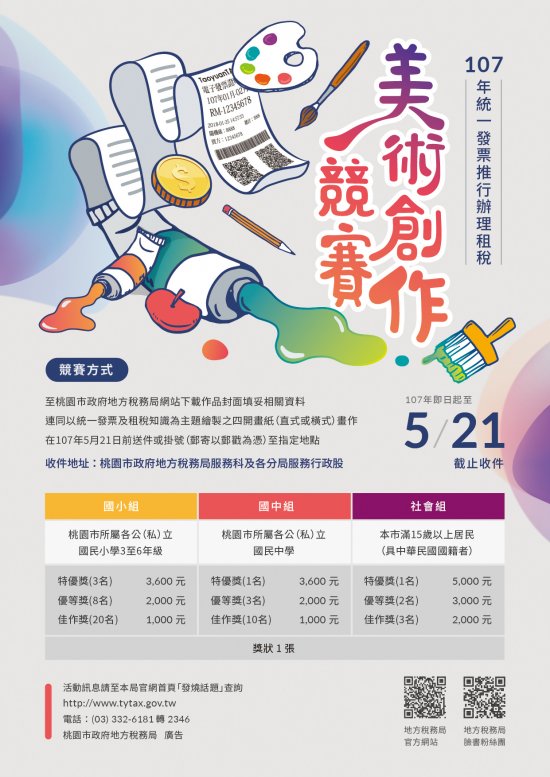 (一)畫作繪製內容:參賽者將推廣行動支付結合電子發票、購物消費索取統一發票、電子發票便利性、地方稅3大稅(房屋稅、地價稅及使用牌照稅)開徵訊息、便民服務措施、多元化繳稅管道、重要稅制及稅政為主題自訂題目,以繪畫方式呈現。