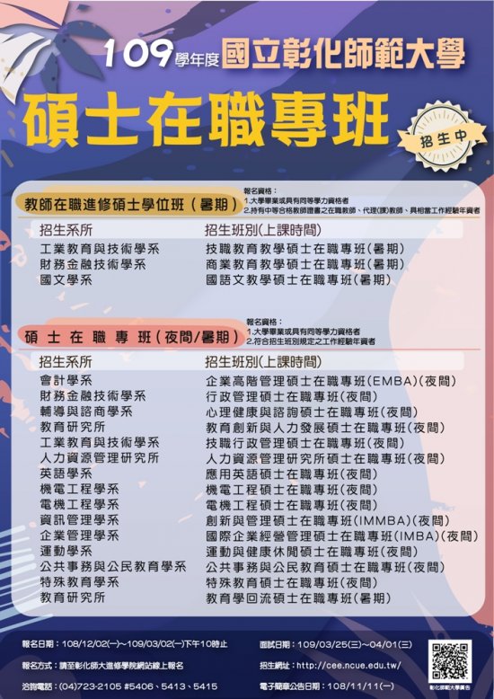 三、本招生資訊敬請公告於 貴機關LED字幕機(跑馬燈)或電視牆,公告內容:「109學年度國立彰化師範大學碩士在職專班招生中,報名自108年12月2日起至109年3月2日下午10時止,更多招生訊息請至彰化師大進修學院官網查詢」。