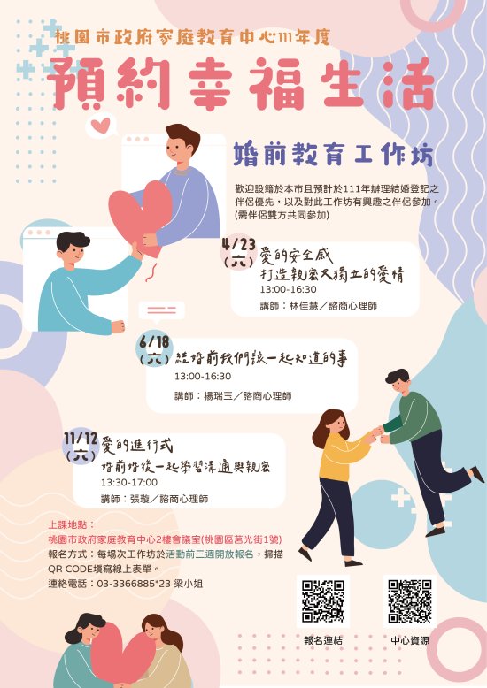 一、 | 依據桃園市政府家庭教育中心111年度預約幸福生活-婚前教育工作坊實施計畫辦理。 |