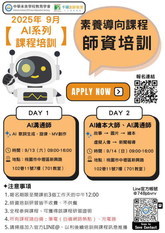 一、 | 隨著人工智慧快速發展,AI素養已成為教育現場重要議題。為協助教師理解AI基礎原理及應用,提升跨領域應用與教學實務能力,本會規劃辦理「AI系列教師增能研習(桃竹場)」。 |