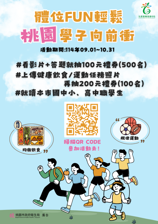 | 主旨: | 函轉本府衛生局辦理114年本市國中小、高中職生「體位FUN輕鬆 桃園學子向前衝」活動簡章及活動海報1份,請鼓勵學生踴躍參與,請查照。 |