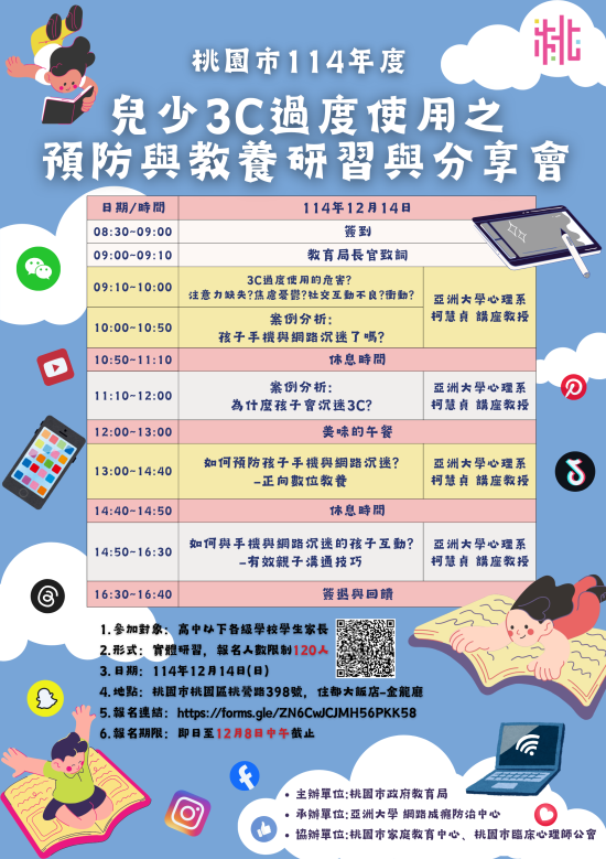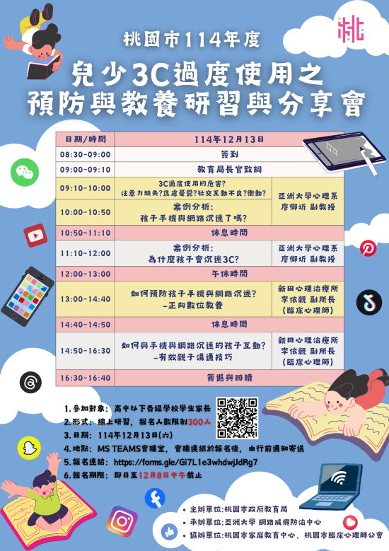 主旨: 檢送本局委請亞洲大學網路成癮防治中心辦理本市114年度「兒少3C過度使用之預防與教養研習與分享會」實施計畫暨海報各1份,請協助推廣資訊,並鼓勵家長踴躍報名,請查照。