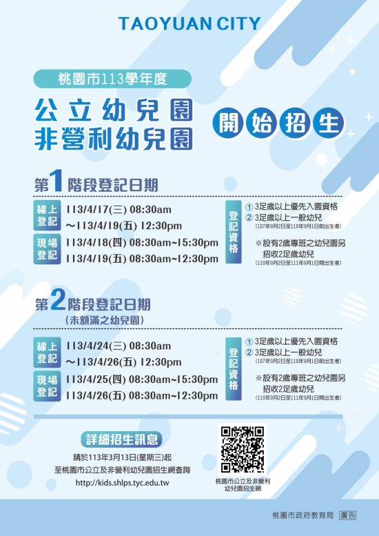 ▶線上登記時間:113 年 4 月 17 日(三)上午 8 時 30 分至 113 年 4 月 19 日(五)中午 12 時 30 分 (幼兒園平日聯絡時間為上午 8 時至下午 4 時)。
