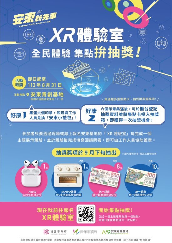 一、 | 本局所轄之安東青創基地以發展XR、元宇宙、區塊鏈、多媒體遊戲及數位影音內容應用相關產業領域為主題,並設有XR體驗館,本期教育及文化為主題,未來將不定期更新主題,並辦理不定期抽獎活動,敬邀貴校師生踴躍參與,期待體驗展能增加學生接觸XR領域的技術及應用。 |