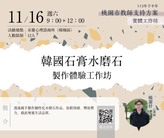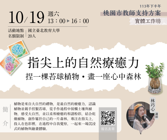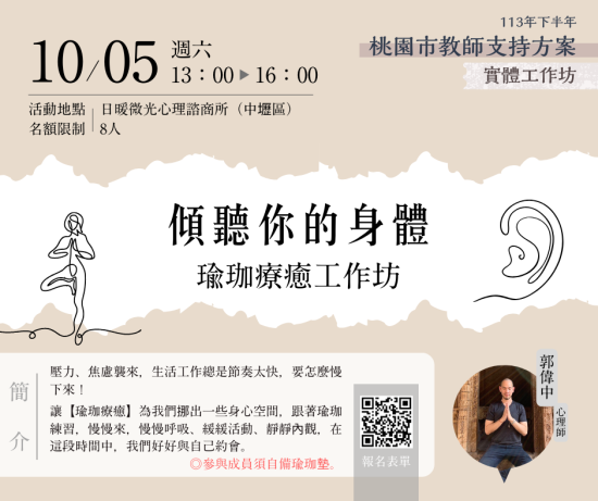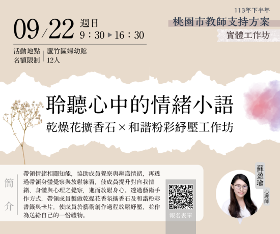 二、 | 為增進本市教師全人成長及自我覺察,且有機會紓解工作壓 力以達身心健康之效,國立臺北教育大學(心理諮商暨健康 促進研究中心)自113年9月22日至11月28日止,規劃辦理4場 次實體工作坊及5場次教師線上研習課程。倘有需求之教師,可逕至本局教師諮商輔導支持服務網站「最新消息」(https://ttsc.whjhs.tyc.edu.tw/news/)參閱課程資訊,並依課程說明至相應網址完成報名程序。 |